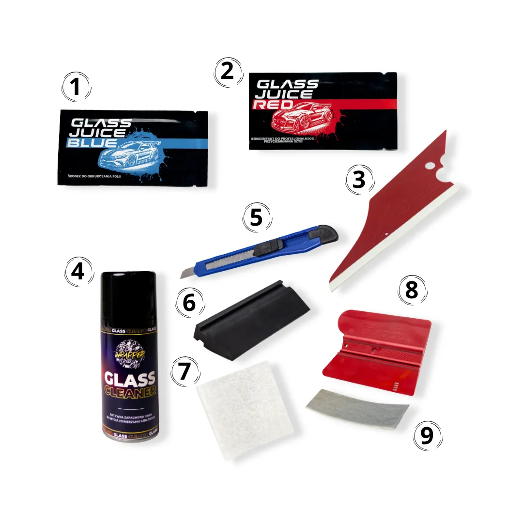 - Glass Juice Red – wysokowydajny koncentrat do aplikacji folii, ułatwia pozycjonowanie i eliminuje pęcherze powietrza.