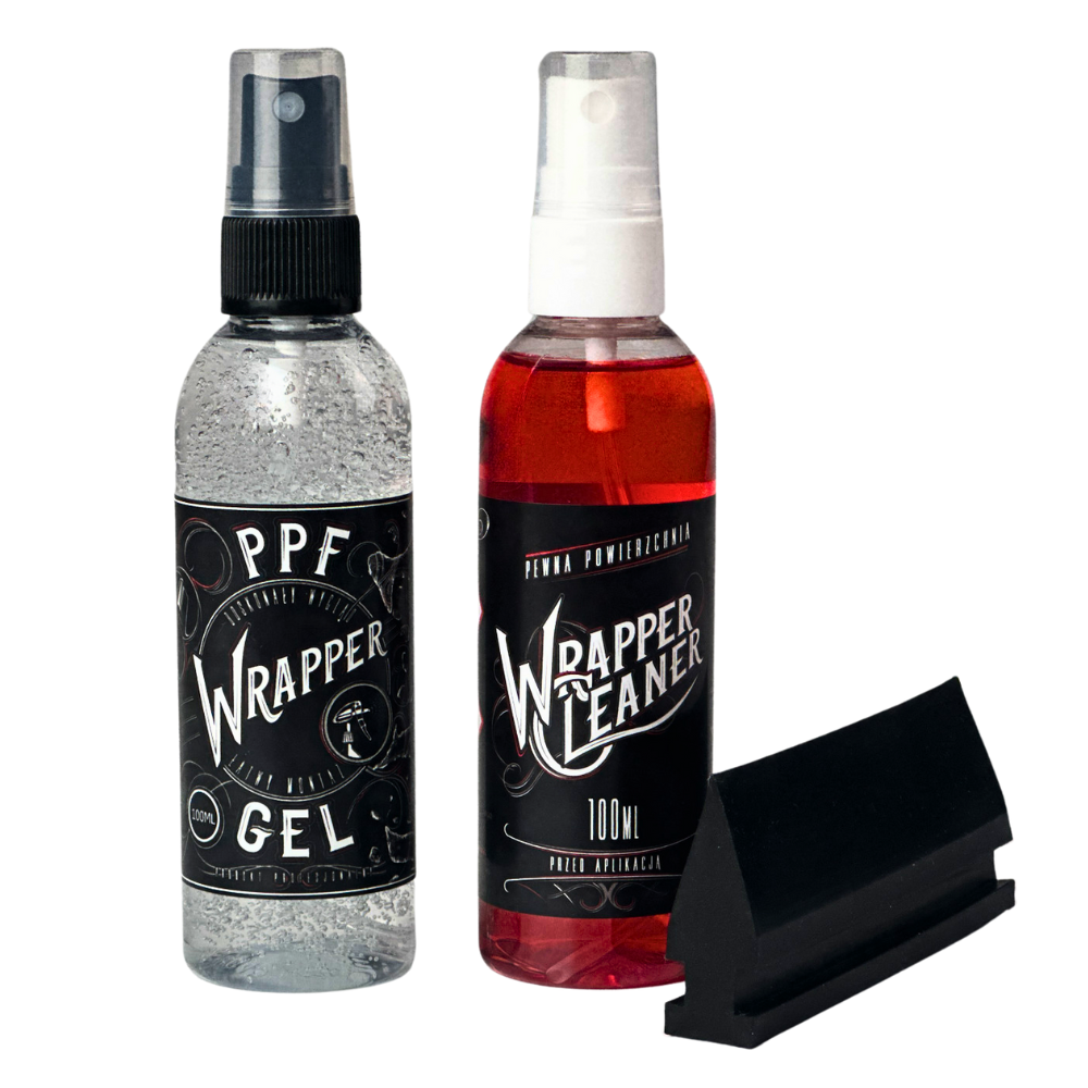 - Wrapper PPF Gel (100 ml) – specjalistyczny żel do montażu folii ochronnych. Ułatwia pozycjonowanie i przesuwanie folii na klejonym elemencie, pozwala zachować właściwy poślizg podczas nakładania, a po usunięciu nie pozostawia smug ani śladów.